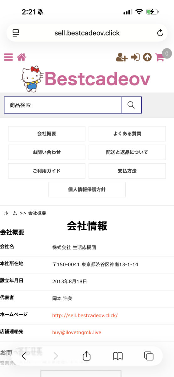 ここで例に挙げているサイトの会社名「株式会社生活応援団」と同名の企業が、正当な通販事業を行っている可能性は否定できません。あくまで当該ドメインのサイトに関する注意喚起です。