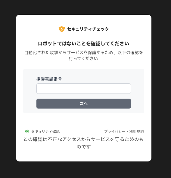 アクセスすると電話番号による認証を求められます。この先は進めていないので不明です。