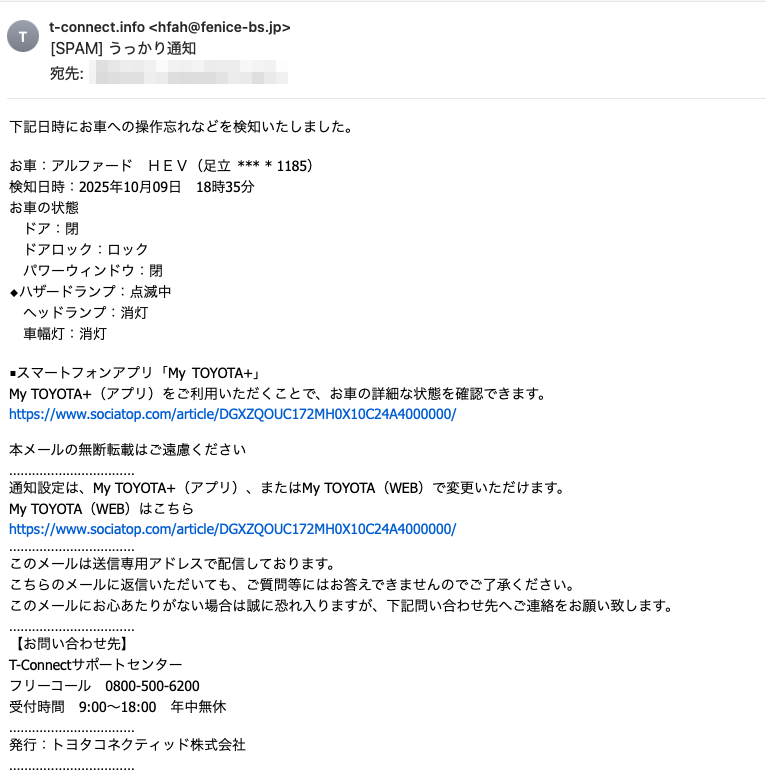 T-Connectサポートセンターを騙るフィッシングメールです。
