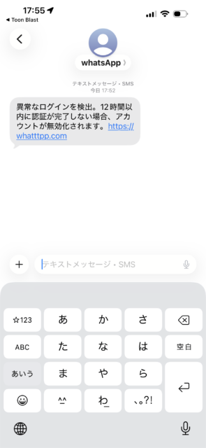 そのWhatsAppを騙るメッセージがSMSで届きました。