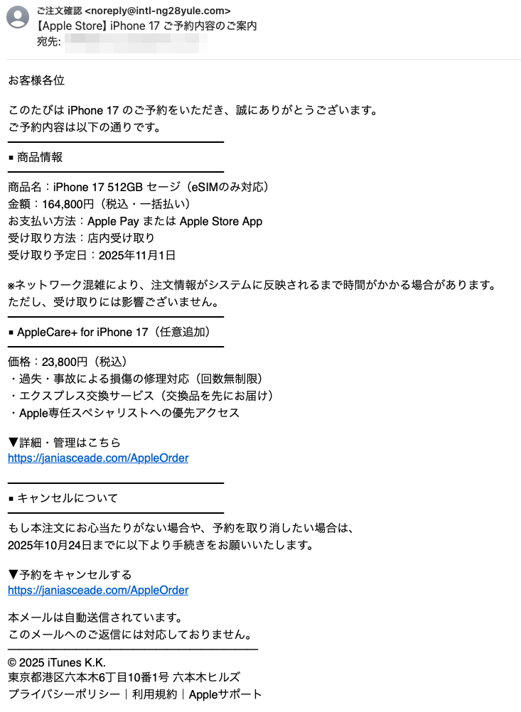 フィッシングメール情報「【Apple Store】iPhone 17 ご予約内容のご案内」