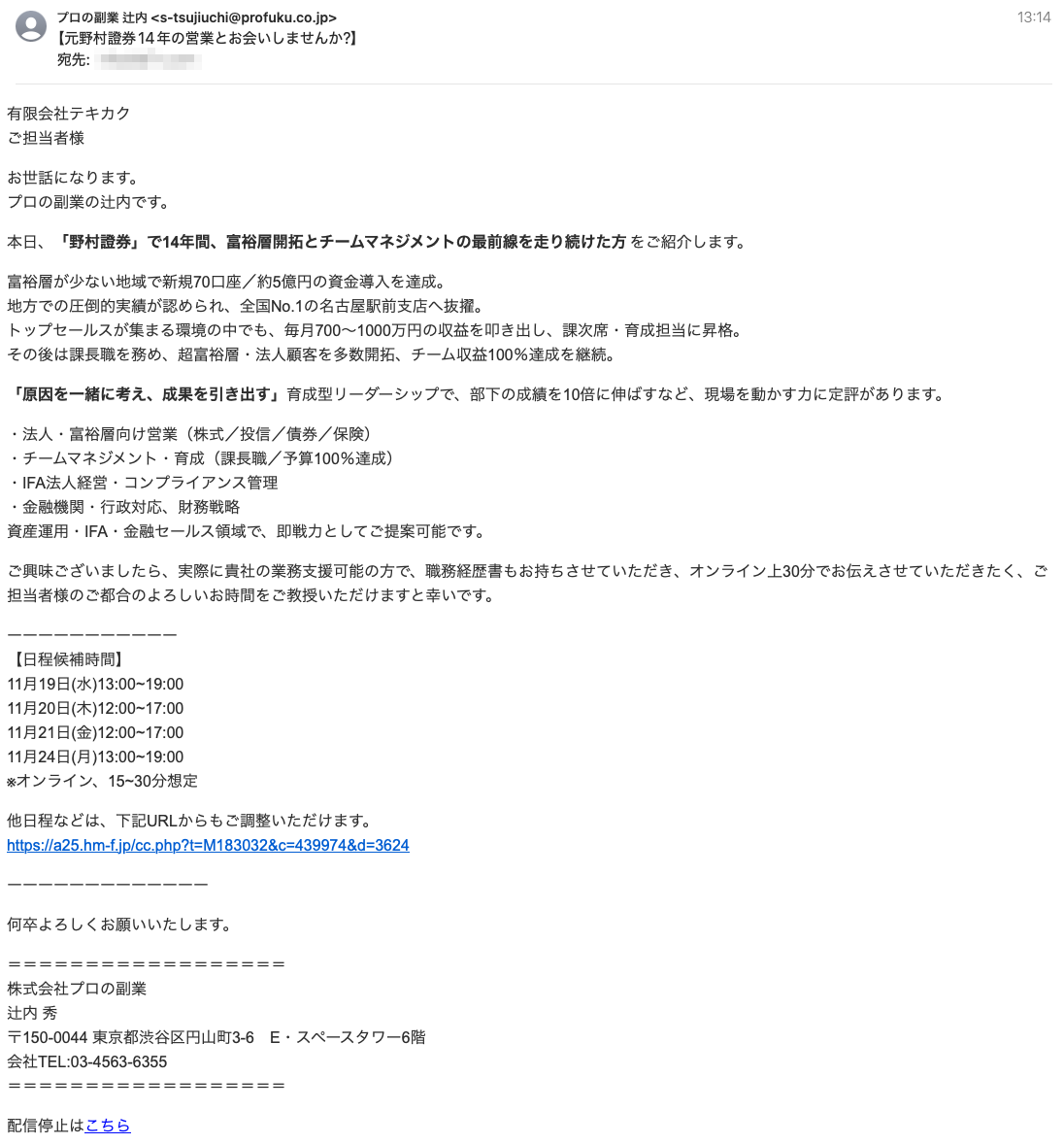 フィッシングメール情報「【元野村證券14年の営業とお会いしませんか?】」