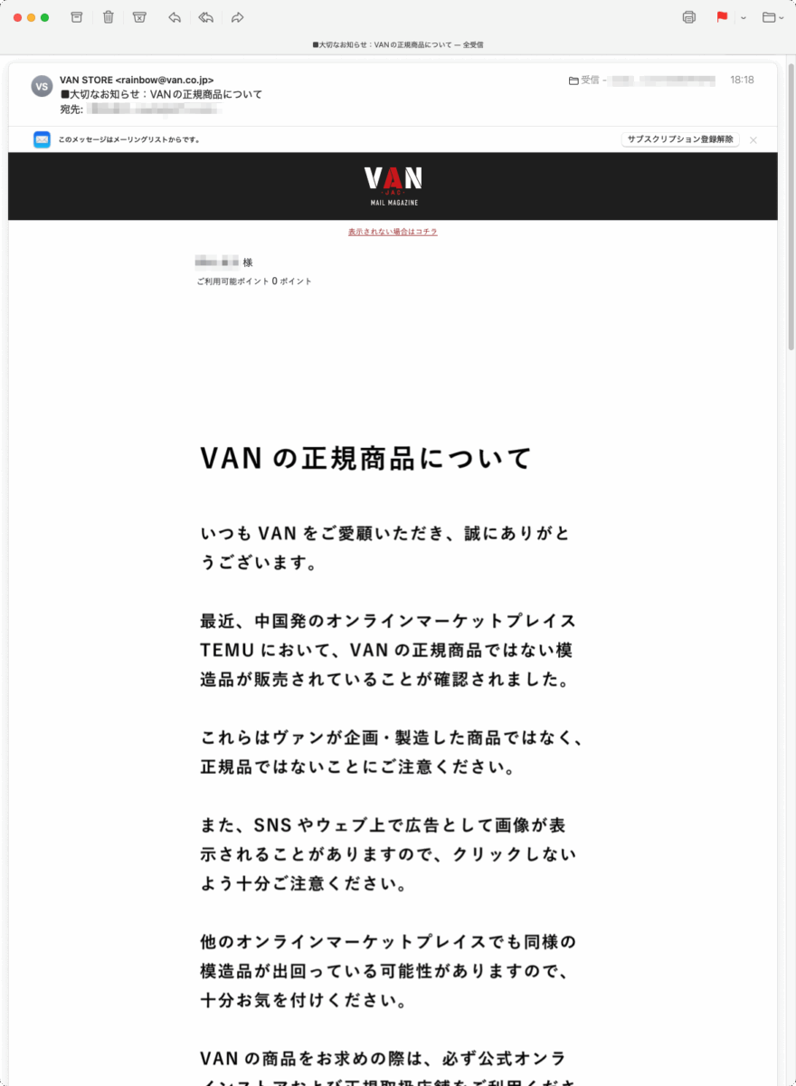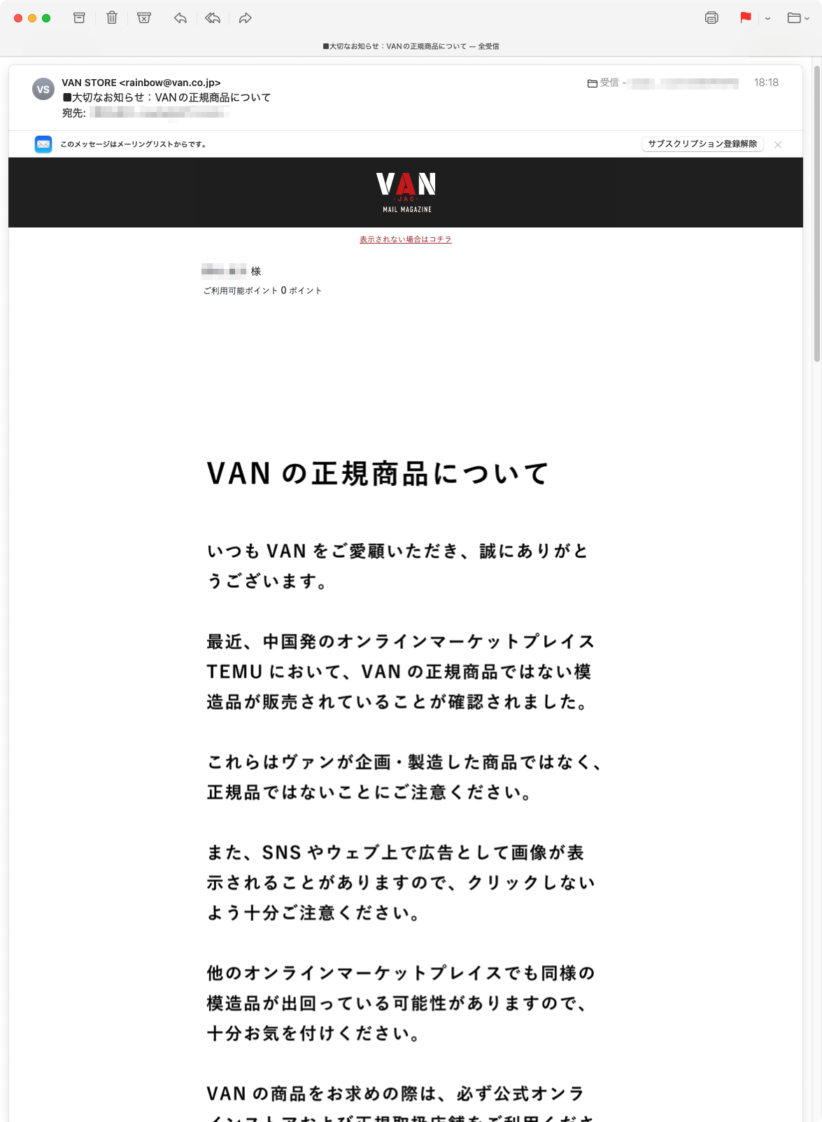 注意喚起「■大切なお知らせ:VANの正規商品について」TEMUの偽商品