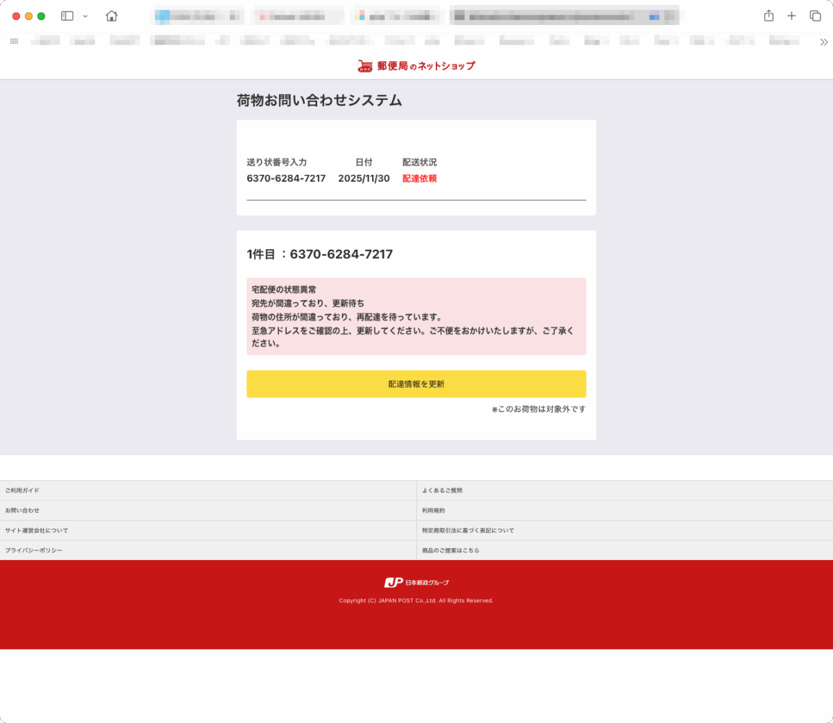 フィッシングメール情報「配達に関する重要なお知らせ!」