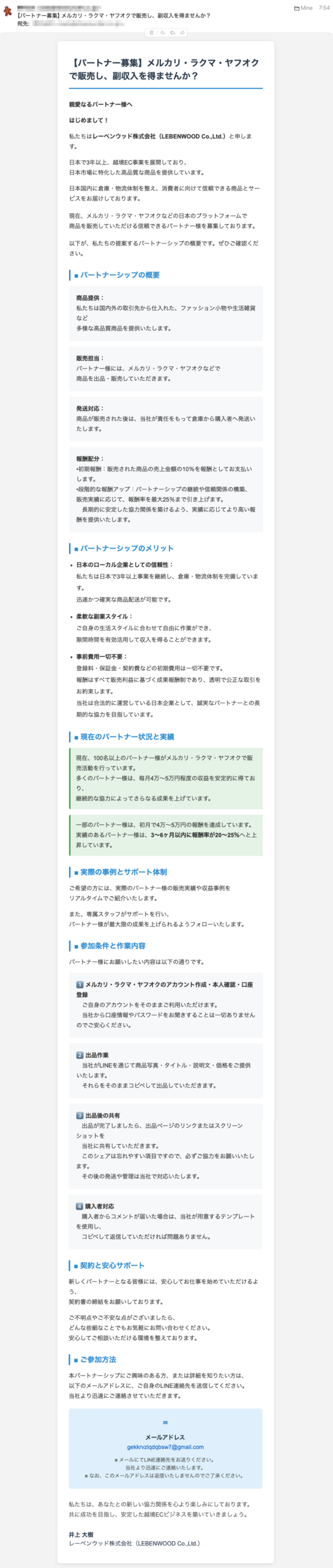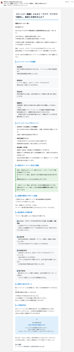 最後の「 ■ ご参加方法 本パートナーシップにご興味のある方、または詳細を知りたい方は、以下のメールアドレスに、ご自身のLINE連絡先を送信してください。当社より迅速にご連絡させていただきます。」というのが、異常な手段です。前投稿の「LINEグループを作って」と同様ですね。