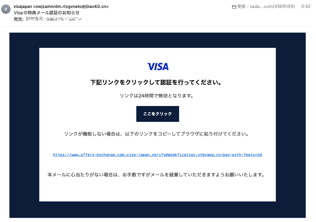 フィッシングメール情報「Visaの特典メール認証のお知らせ」