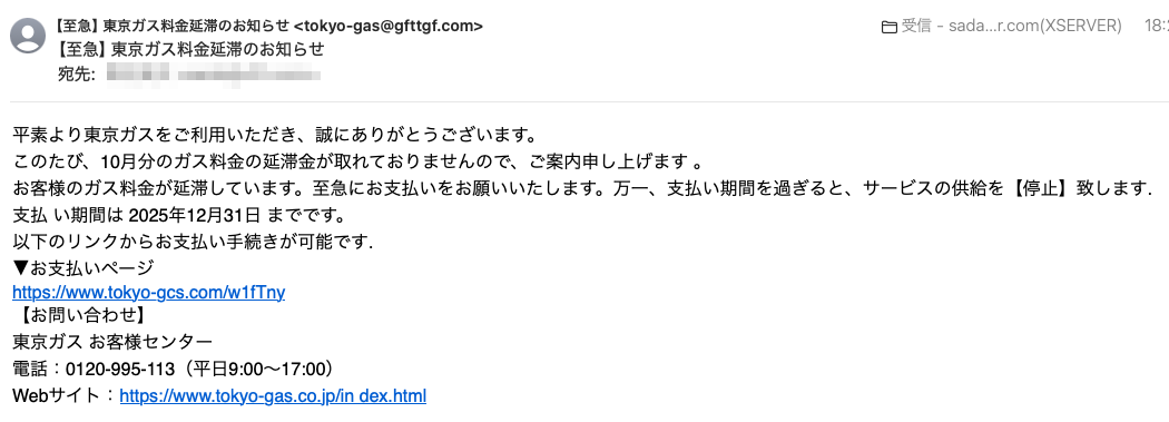 送信者:【至急】東京ガス料金延滞のお知らせ <tokyo-gas@gfttgf.com>