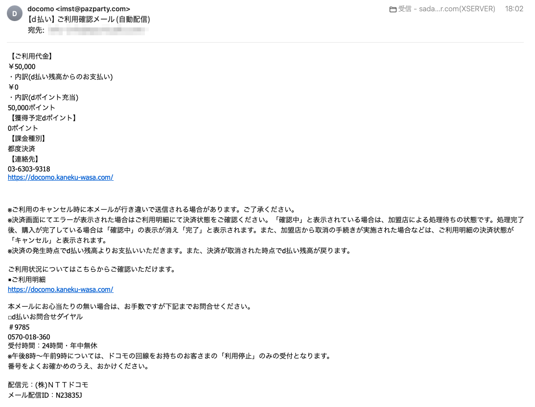 フィッシングメール情報「【d払い】ご利用確認メール(自動配信)」