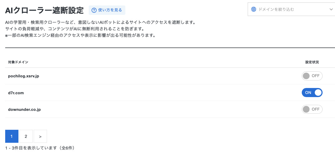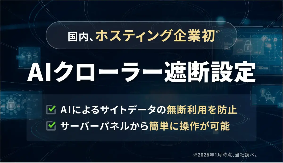XServerでサイトをホスティングしている場合、コントロールパネルで「AIクローラー遮断設定」をONにするだけで主要な生成AIの学習を目的としたクロールを遮断できます。