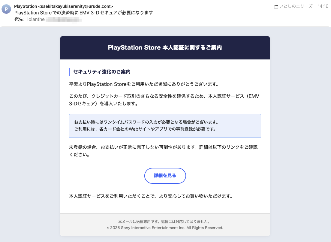 フィッシングメール情報「PlayStation Storeでの決済時にEMV 3-Dセキュアが必要になります」