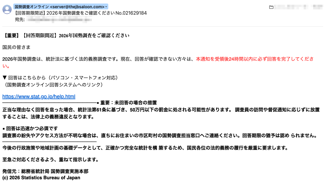 フィッシングメール情報「【回答期限間近】2026年国勢調査をご確認くださいNo.021629184」