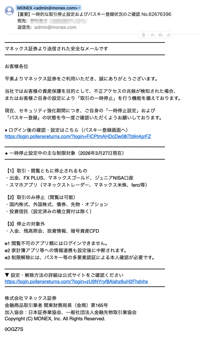 送信者メールアドレスがmonex.comとなっていますが、ログイン先はpollenxreturns.comです。