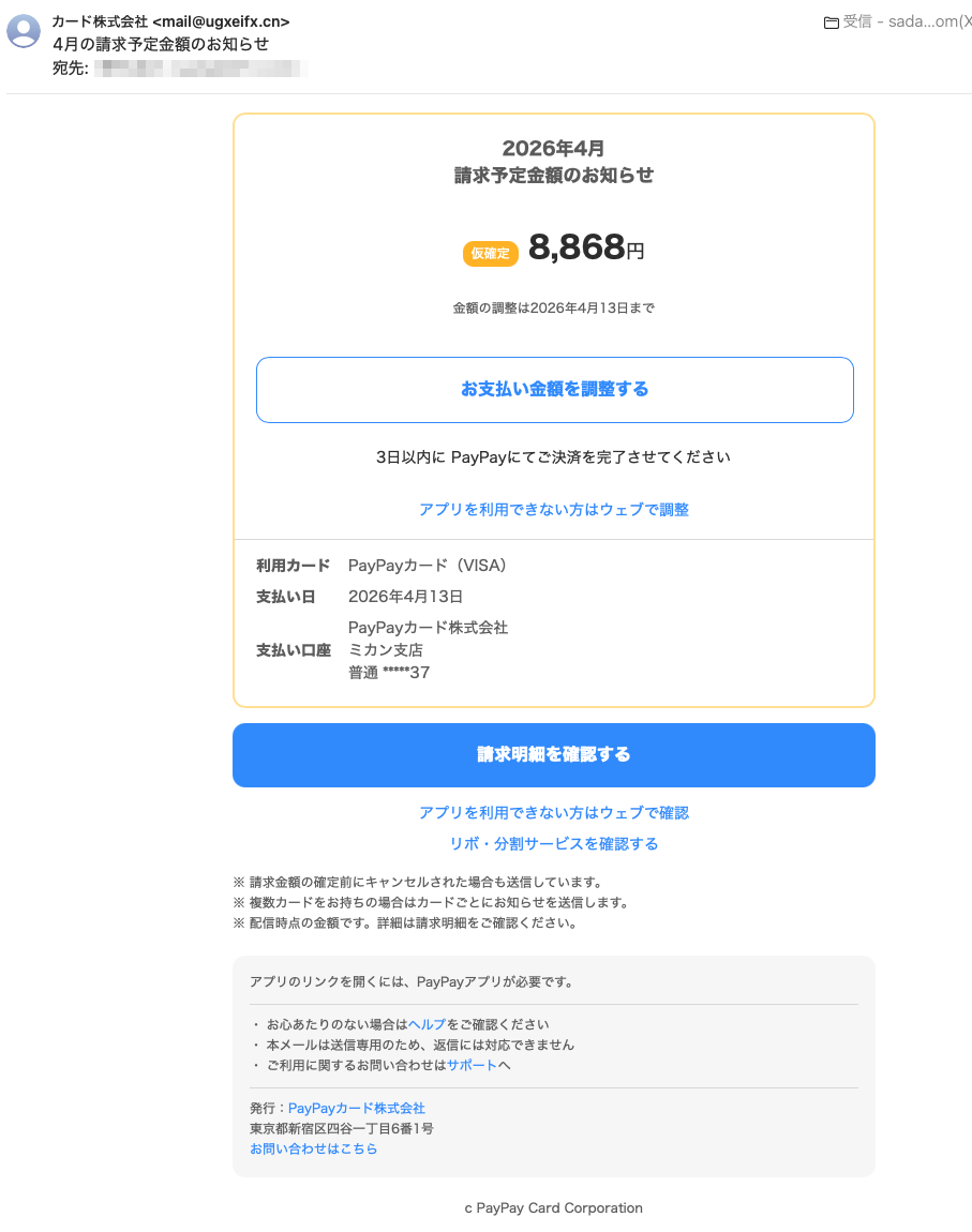 カード株式会社?PayPayカード株式会社?を騙るフィッシングメールです。