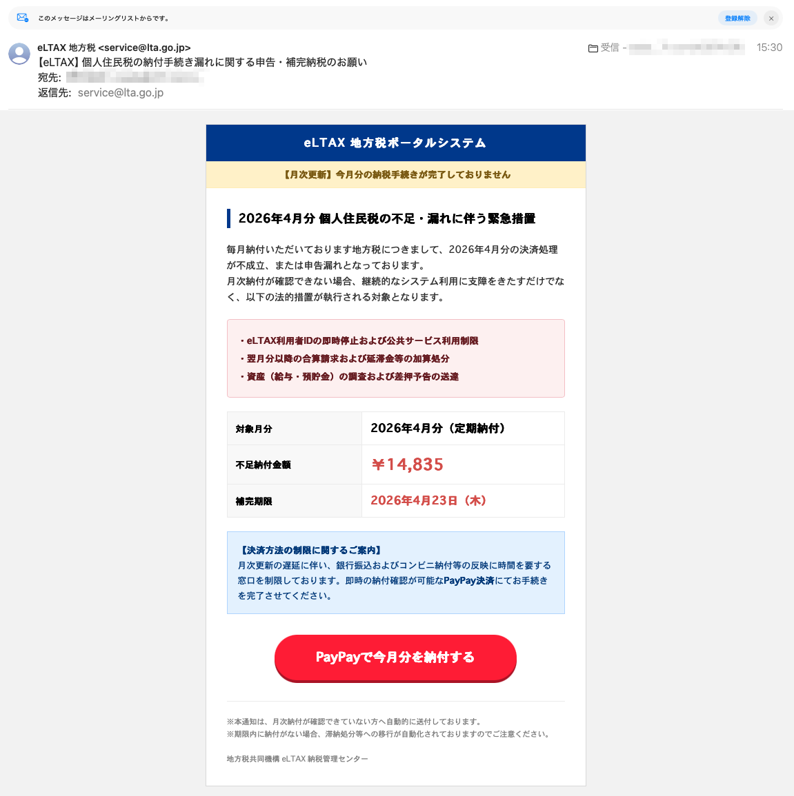 「 地方税共同機構 eLTAX 納税管理センター」を騙るフィッシングメールです。