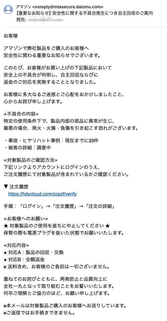 フィッシングメール情報「【重要なお知らせ】安全性に関する不具合発生につき自主回収のご案内」